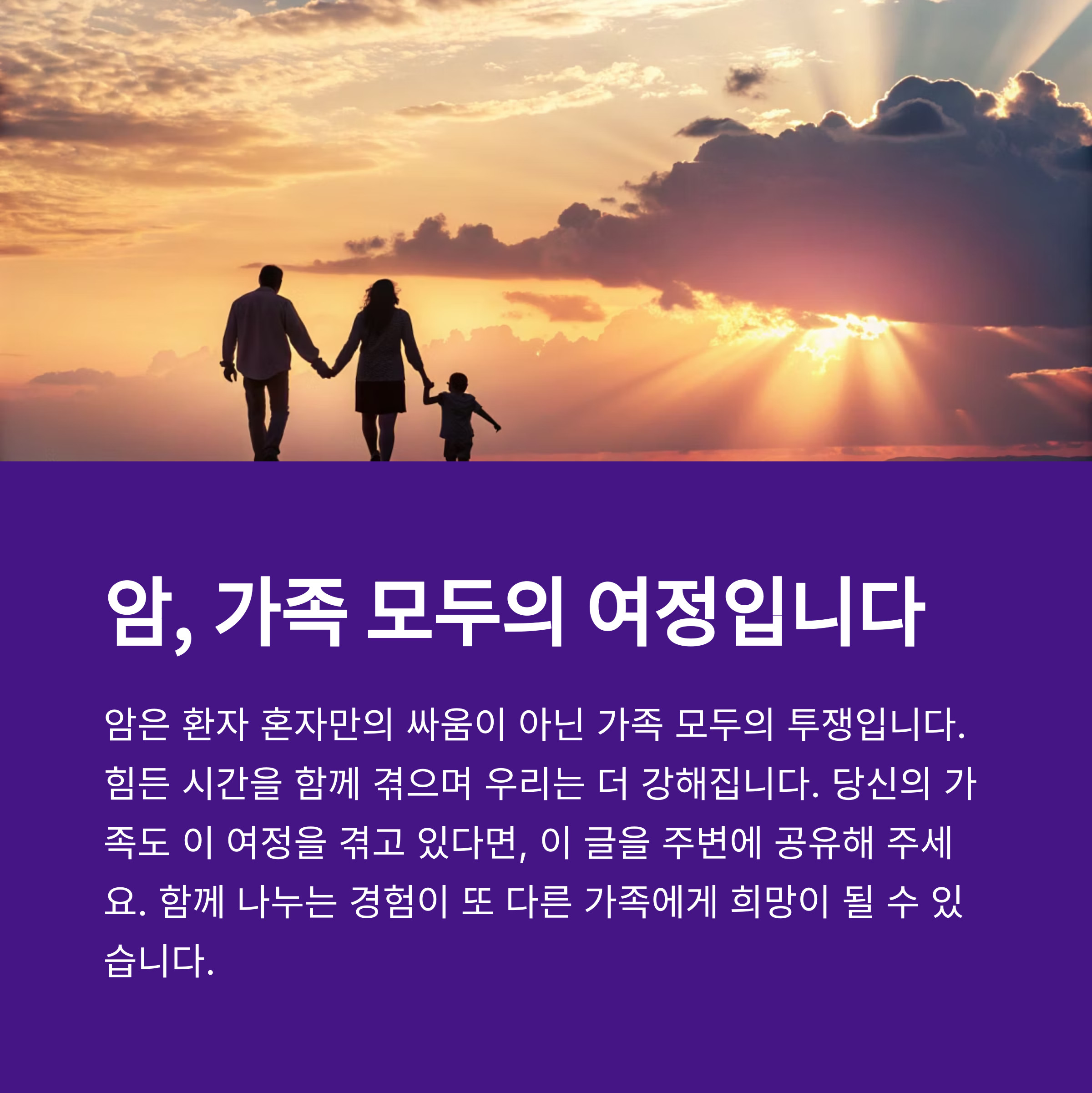 결국 암 가족은 ‘말 못 할 고립’ 속에서 고군분투합니다. 온라인 환우 가족 커뮤니티나 지자체 프로그램을 이용하는 것이 도움이 될 수 있습니다.